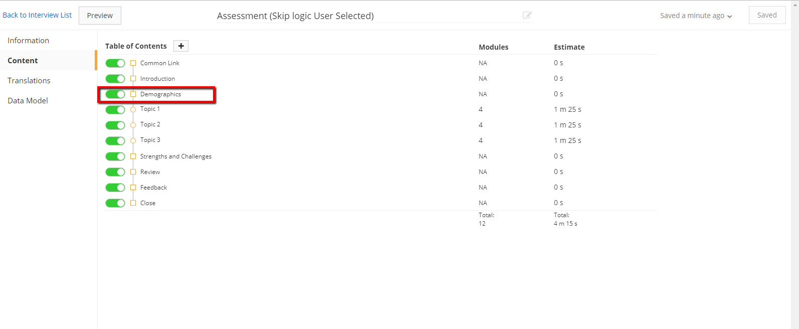 For user selected skip logic we need to follow a process after building the assessment. First we will add demographics from the Demographics page.
