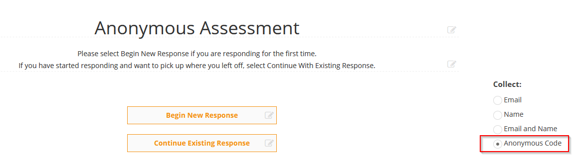 Unlike an email address based workflow, where a participant enters their email address, and can use their email address to access the survey again, this method generates a unique code that a user needs to save to their computer if they want to access the survey again after saving and exiting the survey.